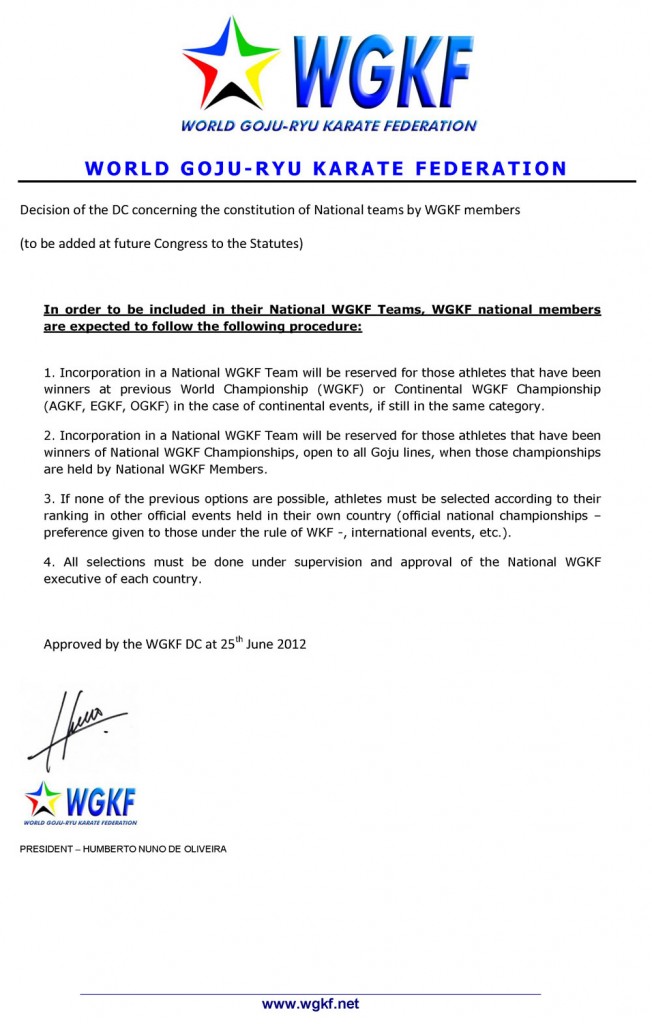 Decision National Teams August 29, 2012 | No Comments Decision of the DC concerning the constitution of National teams by WGKF members (to be added at future Congress to the Statutes) New
